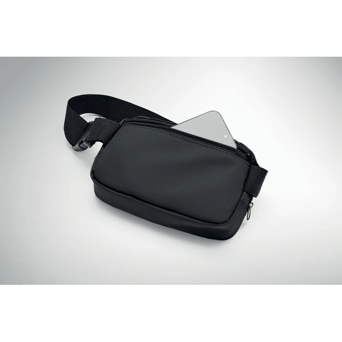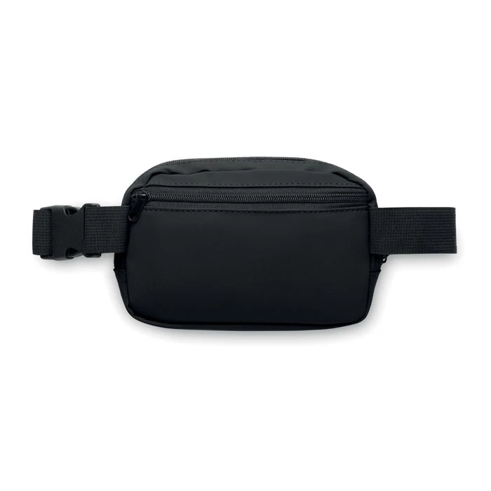 Torba biodrowa, nerka (cross body) z miękkiego PU z podszewką z poliestru 210D RPET. 1 główna kieszeń zapinana na zamek, 1 tylna kieszeń zapinana na zamek i wewnętrzna przegroda z siateczki.
