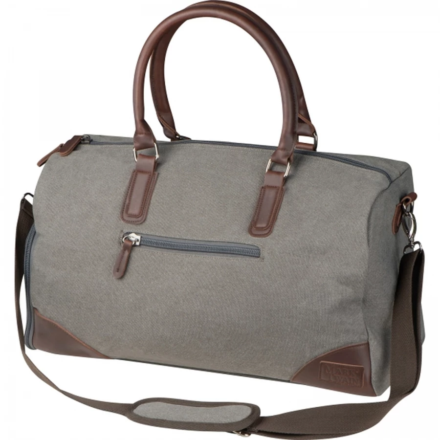 Stylowa i użyteczna torba podróżna marki Mark Twain, wykonana wytrzymałego płóciennego materiału z kontrastującymi wstawkami z ekoskóry. Posiada długi, odpinanay pasek do noszenia na ramieniu.