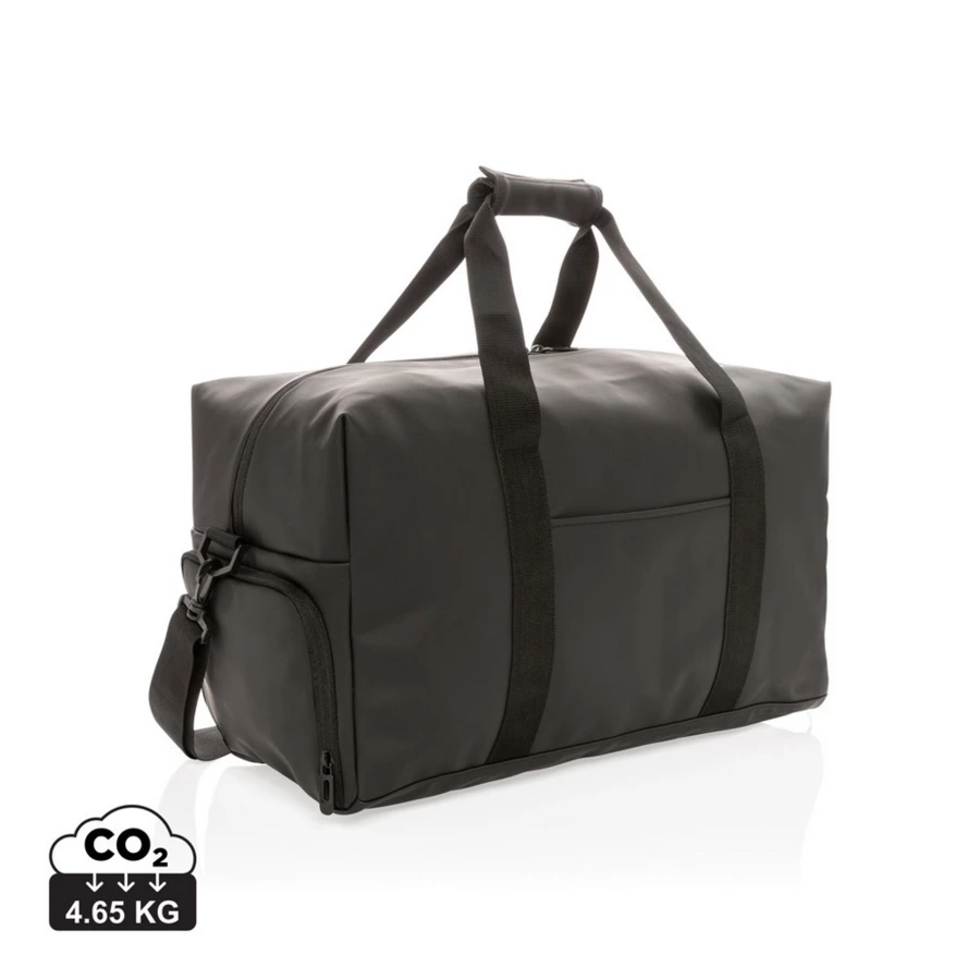 Torba podróżna, sportowa, wykonana z PU miękkiego, wewnątrz poliester 210D, minimalistyczny design, przestronna przegroda główna z kieszenią wewnątrz, kieszeń na buty z boku, z przodu kieszeń na akcesoria, posiada rączkę oraz regulowany pasek na ramię, nie zawiera PVC, ślad węglowy produktu: 4,65 kg CO2