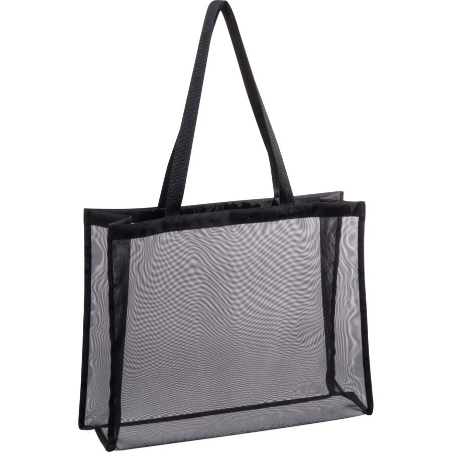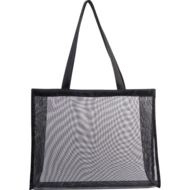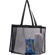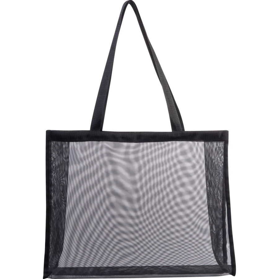 Duża, przezroczysta torba, wykonana z poliestru, wyposażona w długie uchwyty do noszenia.