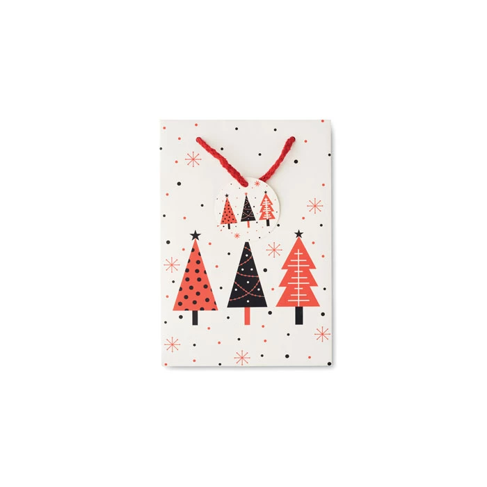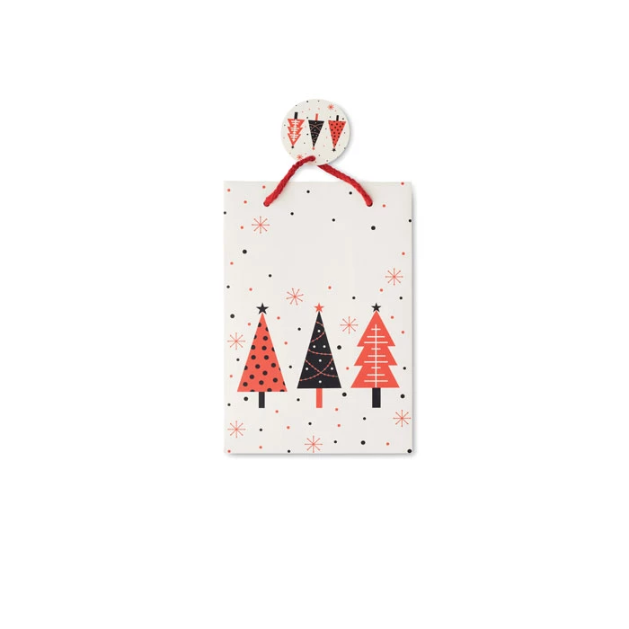 Świąteczna mała papierowa torba prezentowa (30% z recyklingu) z dołączoną przywieszką. 128 gr/m². FSC®-certified | FSC MIX, P5.3, FSC- C213206