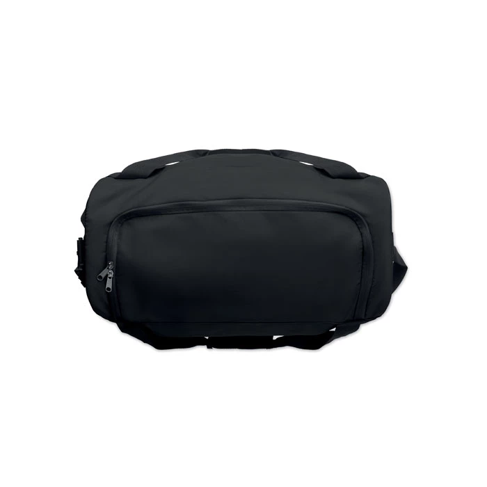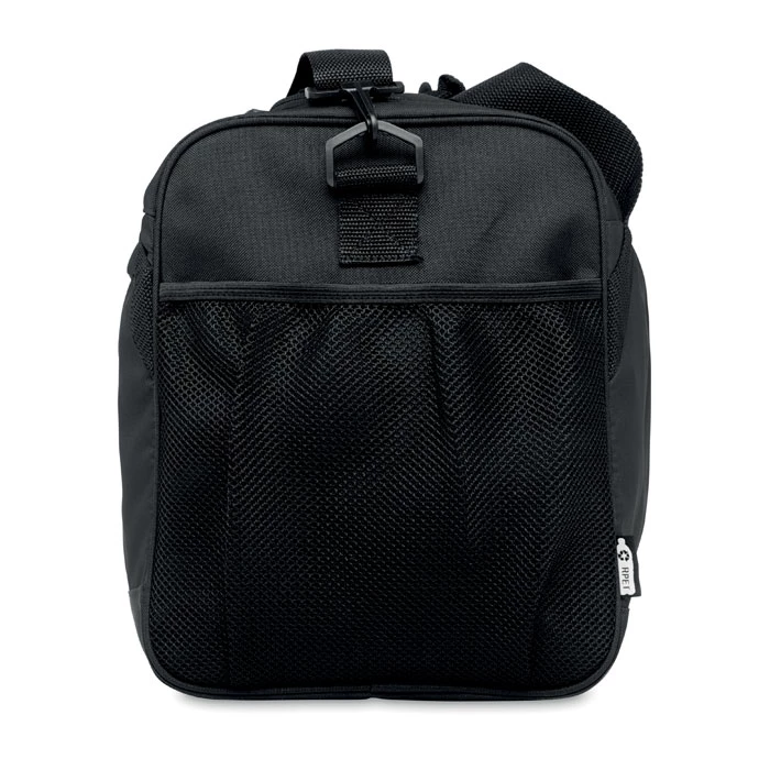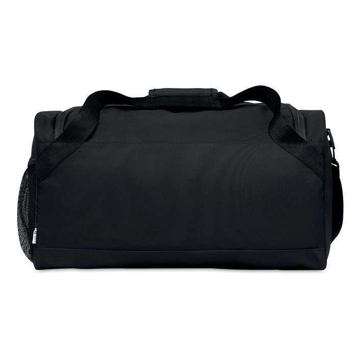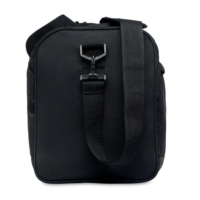 Torba sportowa lub podróżna z 600D RPET z dużą przednią kieszenią zapinaną na zamek, wewnętrzną kieszenią zapinaną na zamek oraz regulowanym i odpinanym paskiem na ramię.