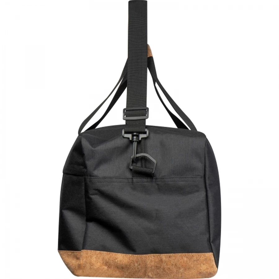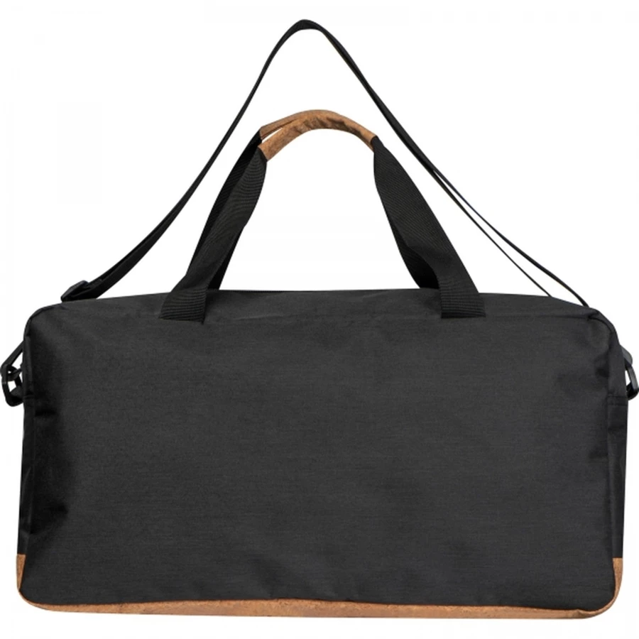Torba sportowa wykonana z materiału RPET, z korkowym dnem. Torba posiada dużą komorę zamykaną na zamek oraz mniejszą, frontową kieszeń, dwa krótkie uchwyty i długi, odpinany pasek na ramię.