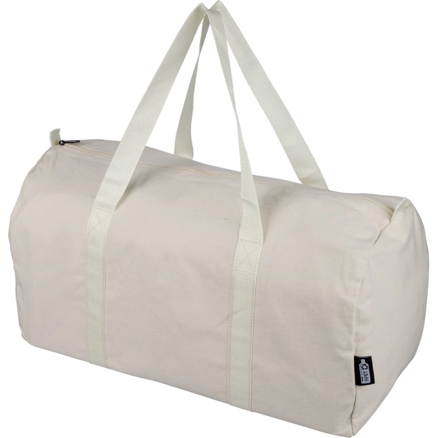 Torba sportowa, podróżna, 330 g/m² o pojemności ok. 30 litrów, podszewka z poliestru 210 D, duża kieszeń zapinana na zamek z wierzchu, posiada długie uchwyty umożliwiające noszenie na ramieniu (100 x 3 cm), ikona RPET na metce, produkt wykonany z polibawełny z recyklingu, poliestru i RPET