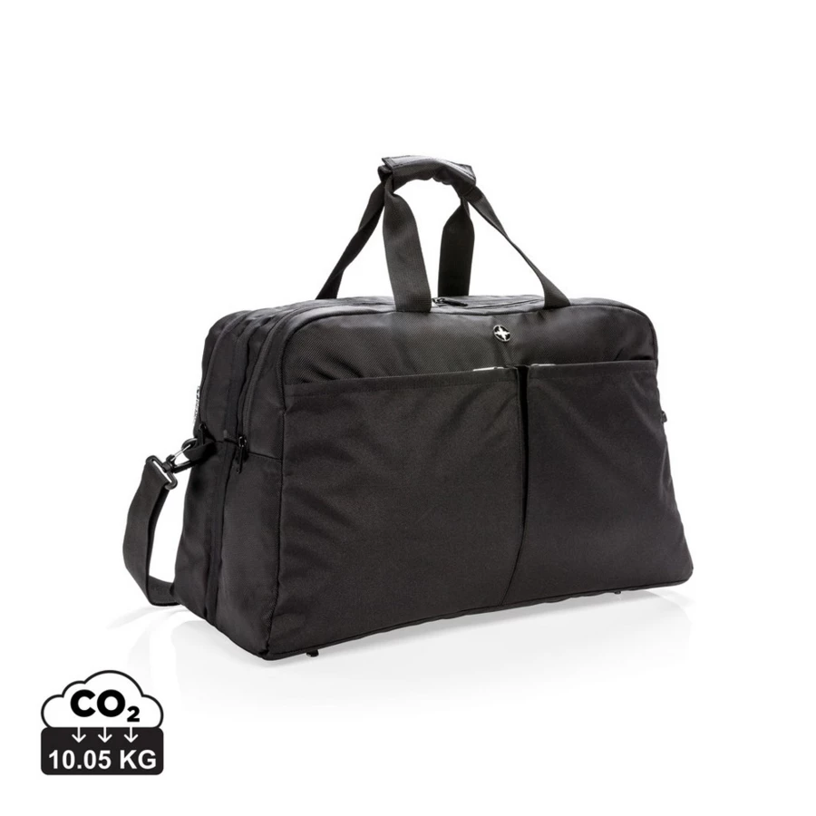 Torba sportowa, podróżna z kieszenią na laptopa 15,6", ochrona RFID, hybrydowa konstrukcja zapewniająca łatwe przenoszenie, wygodny system otwierania i organizowania rzeczy jak walizka, zamykana na zamek błyskawiczny z dostępem do podwójnej przegrody, z tyłu kieszeń na prasę oraz zamykana na zamek kieszeń z ochroną RFID i łatwym dostępem, z przodu 2 duże kieszenie na zamek błyskawiczny, nie zawiera PVC, ślad węglowy produktu: 10,05 kg CO2