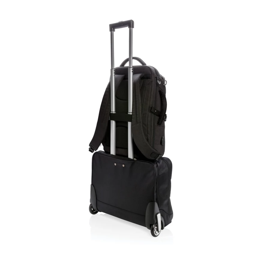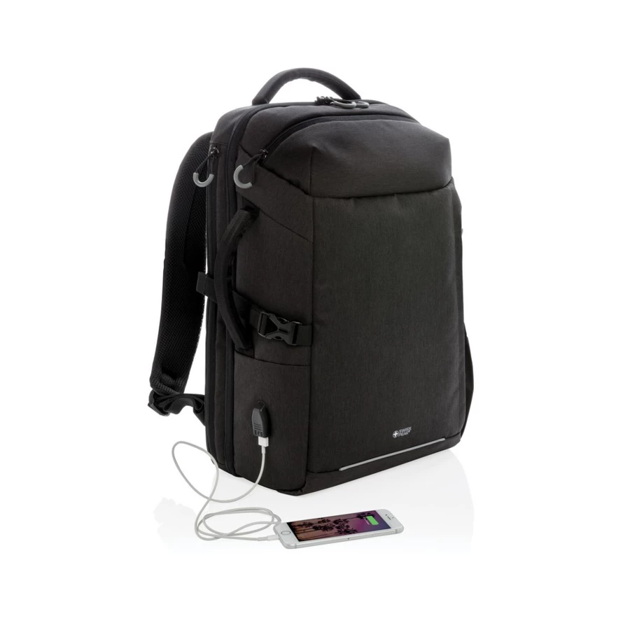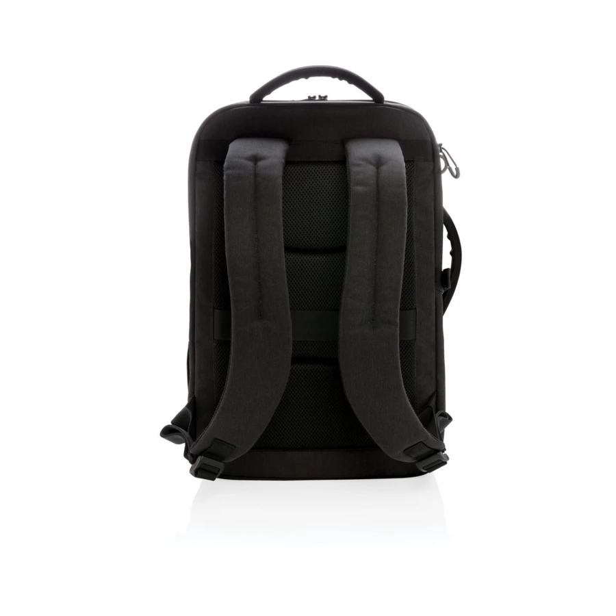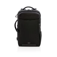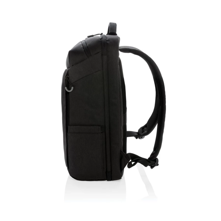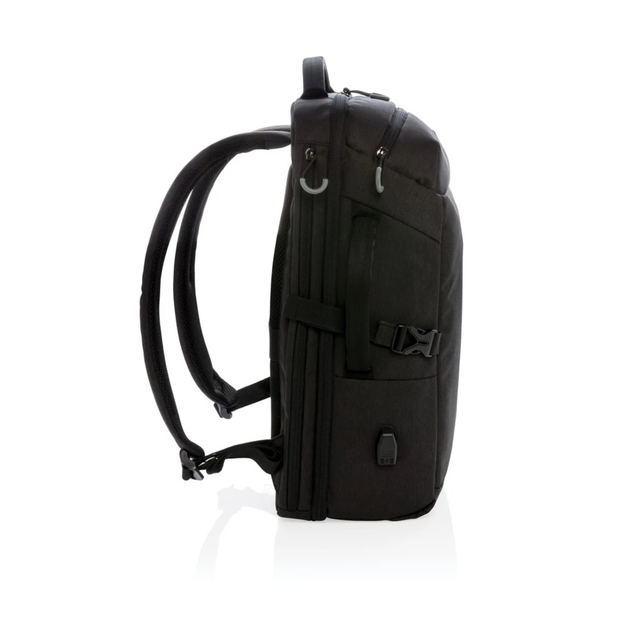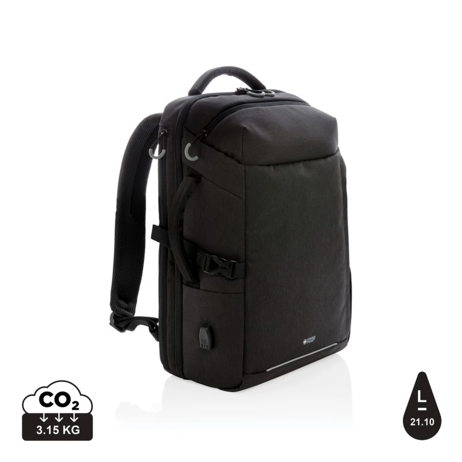 Plecak na laptopa 17", wyściełana przegroda na laptopa, kieszeń z boku, kieszeń szybkiego dostępu na górze, kieszenie z ochroną RFID, wyjście USB do ładowania (power-bank nie jest dołączony), wykonany z RPET, posiada wbudowany znacznik AWARE™, który potwierdza wykorzystanie materiałów z recyklingu, dzięki wykorzystaniu materiałów z recyklingu przy produkcji tej torby udało się zaoszczędzić 21l wody, 2% wpływów z każdego sprzedanego produktu z kolekcji Impact jest przekazywane na rzecz Water.org
