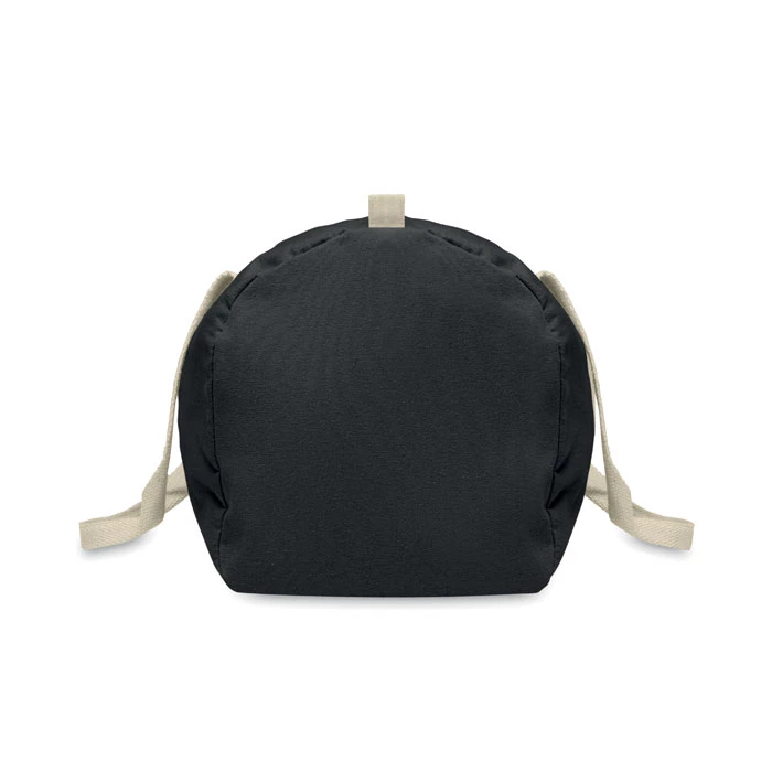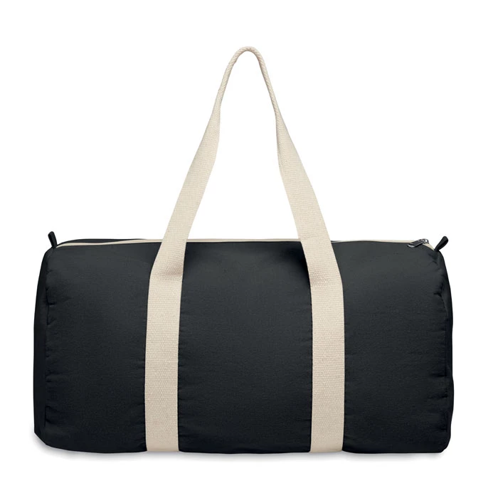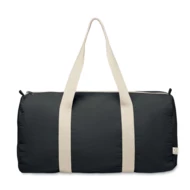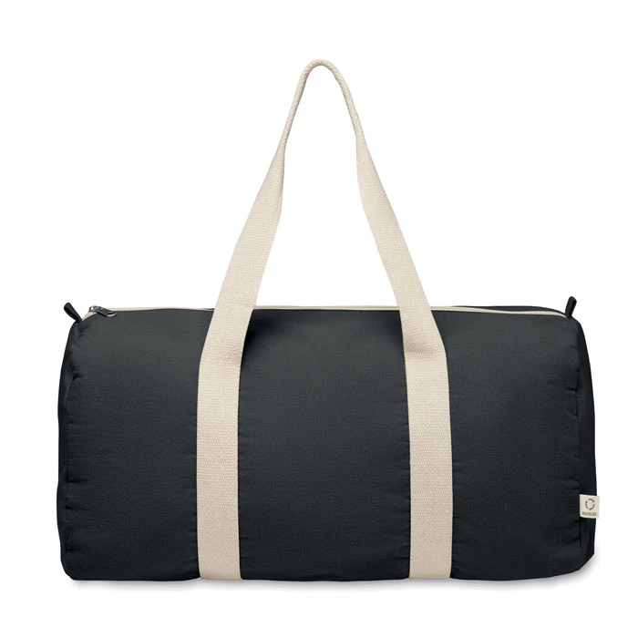 Torba sportowa i podróżna z zapinaną na zamek przegrodą boczną i zapinaną na zamek kieszenią wewnętrzną z bawełny z recyklingu 320 gr/m² (80%) i poliestru z recyklingu (20%) z długimi uchwytami.