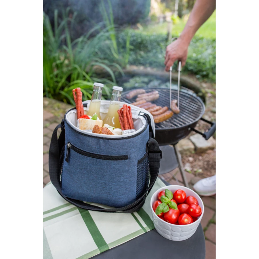 Torba termoizolacyjna, przegroda główna i przednia kieszeń zamykane na zamek błyskawiczny, 2 boczne kieszenie siateczkowe, uchwyt do noszenia oraz regulowany pasek na ramię