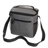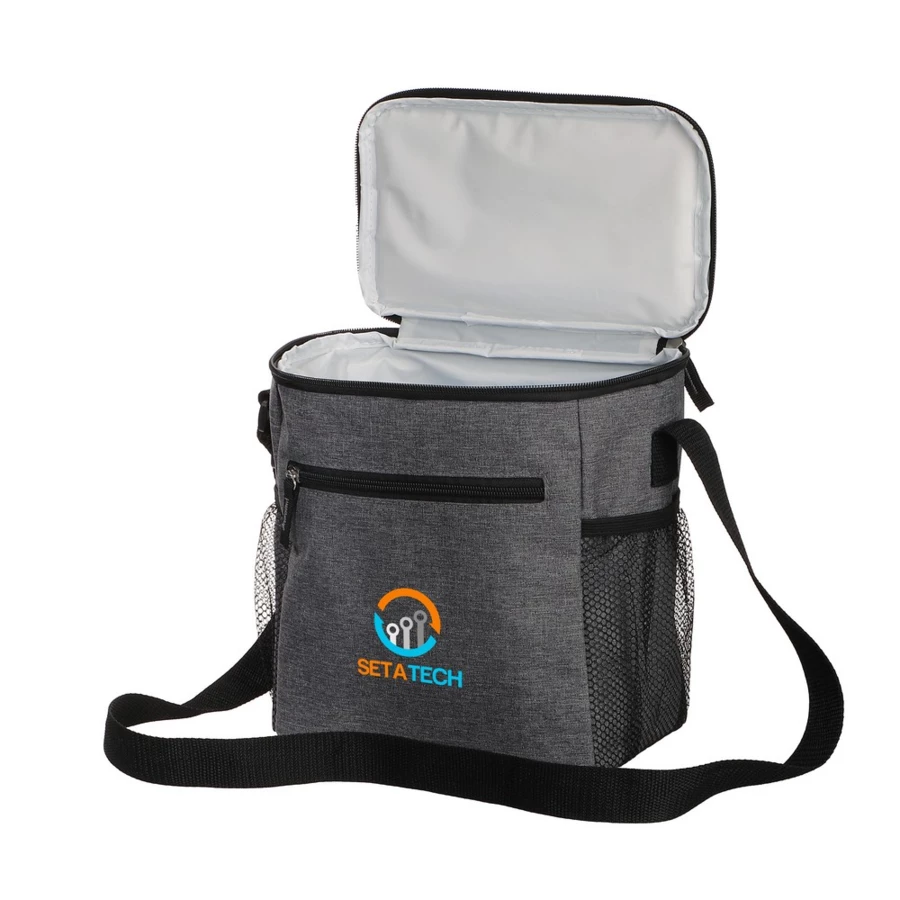 Torba termoizolacyjna, przegroda główna i przednia kieszeń zamykane na zamek błyskawiczny, 2 boczne kieszenie siateczkowe, uchwyt do noszenia oraz regulowany pasek na ramię
