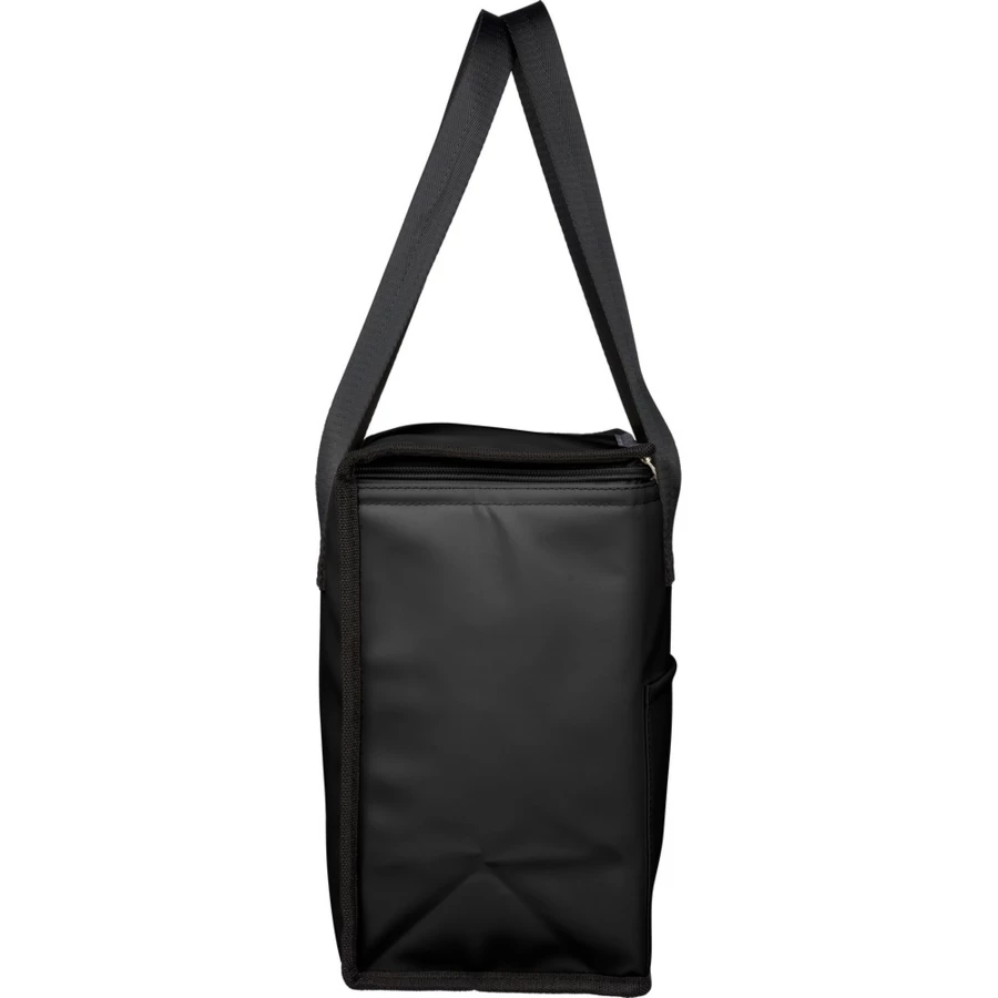 Torba termoizolacyjna o pojemności 9 litrów, posiada długie uchwyty do noszenia na ramieniu (2,5 × 66 cm), kieszeń przednia, ikona recyklingu na metce, produkt wykonany z PU z recyklingu z poliestrową podszewką