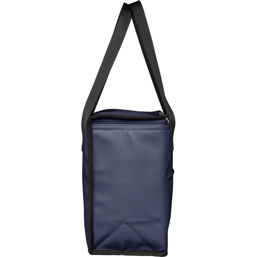 Torba termoizolacyjna o pojemności 9 litrów, posiada długie uchwyty do noszenia na ramieniu (2,5 × 66 cm), kieszeń przednia, ikona recyklingu na metce, produkt wykonany z PU z recyklingu z poliestrową podszewką