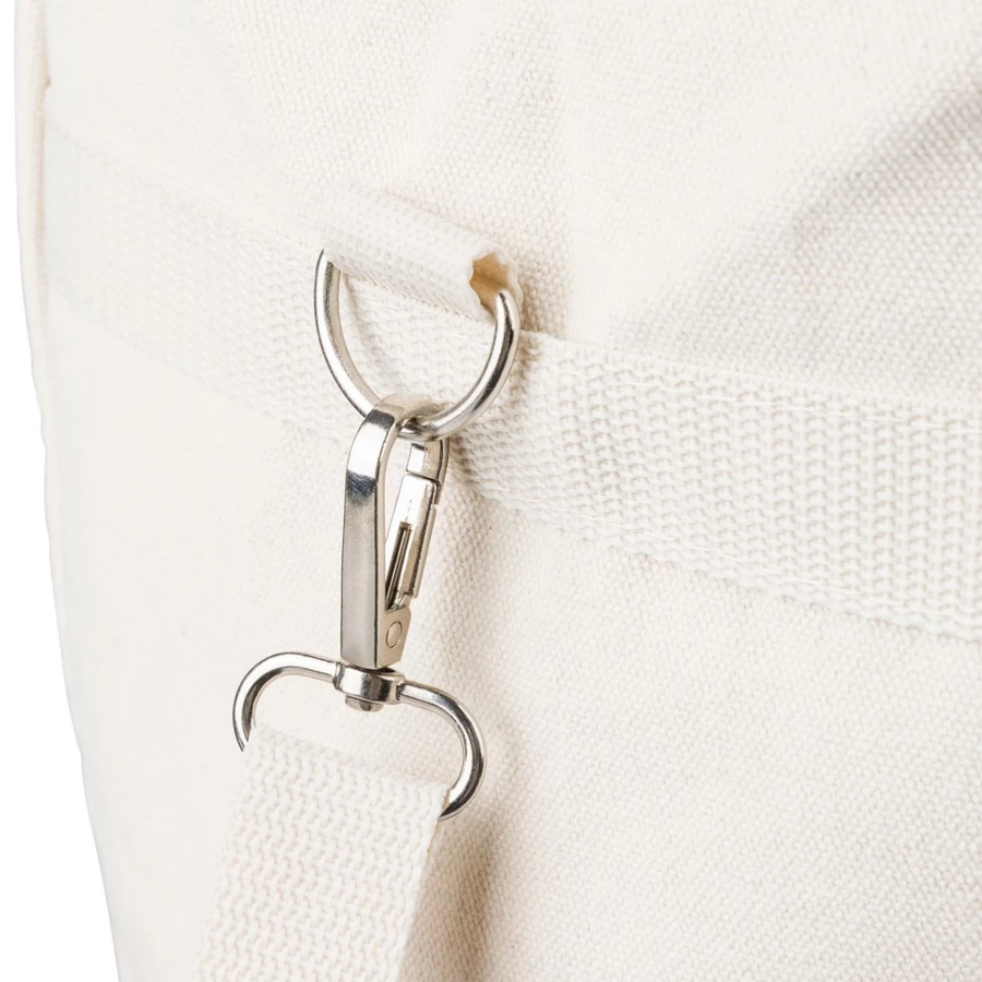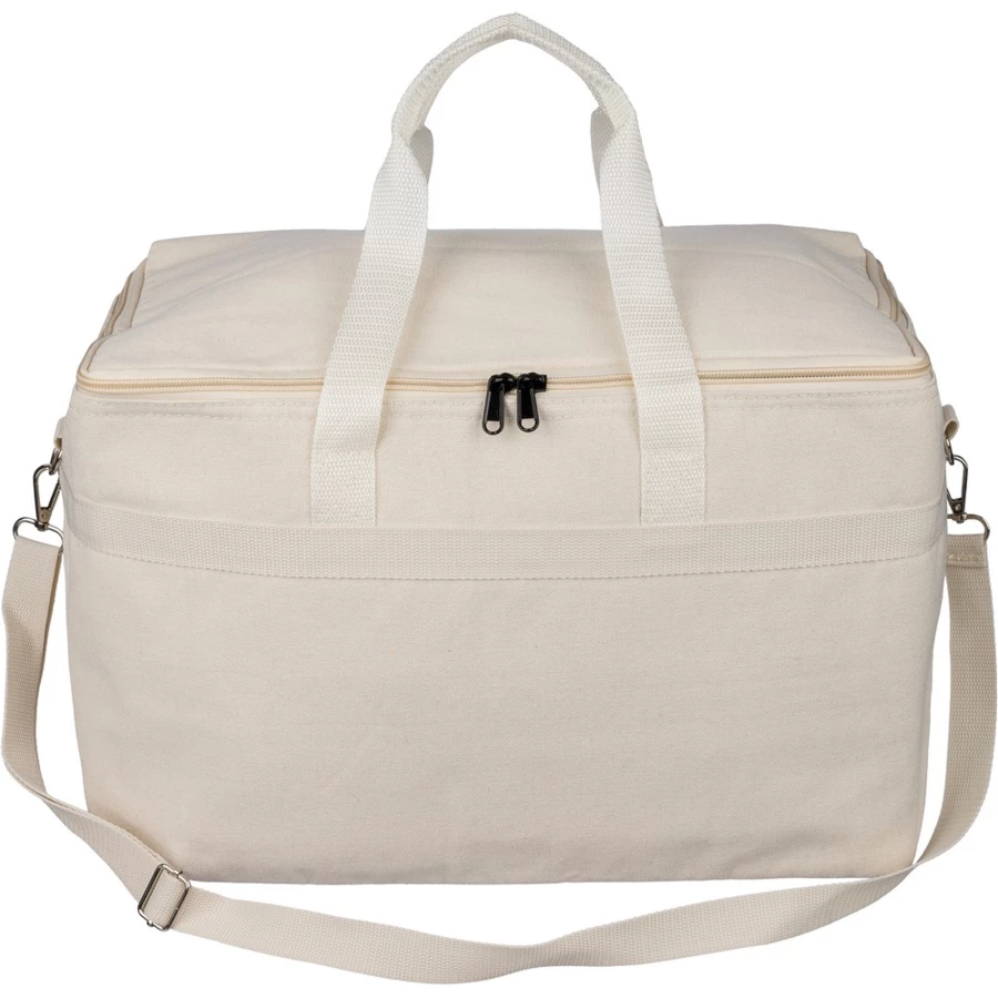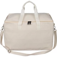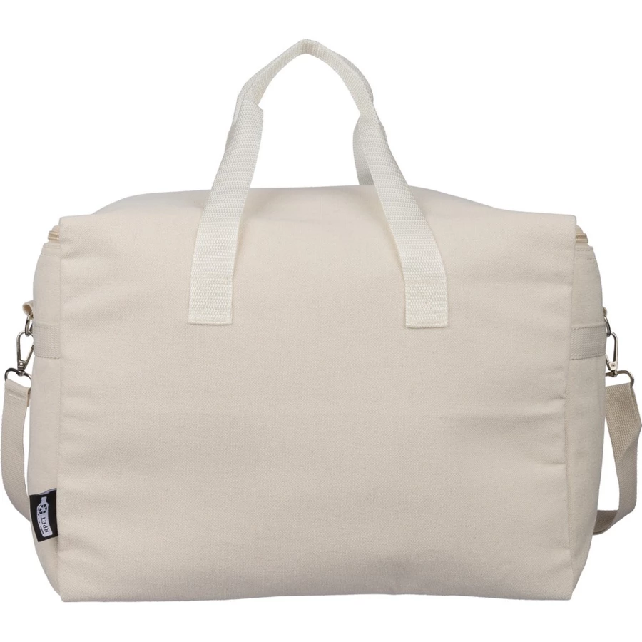 Torba termoizolacyjna 330 g/m² o pojemności 23 l, dwa uchwyty do noszenia (3,5 x 60 cm), posiada regulowany uchwyt umożliwiający noszenie na ramieniu (2,5 x 110 cm), metalowa klamra, wnętrze wyłożone folią aluminiową, ikona RPET na metce, produkt wykonany z polibawełny z recyklingu, folii aluminiowej i RPET
