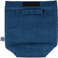 Torba termoizolacyjna o pojemności ok. 8 litrów, krótki uchwyt do noszenia, kieszeń z przodu, zapięcie na rzep, PEVA w środku, ikona recyklingu, produkt wykonany z denimu z recyklingu