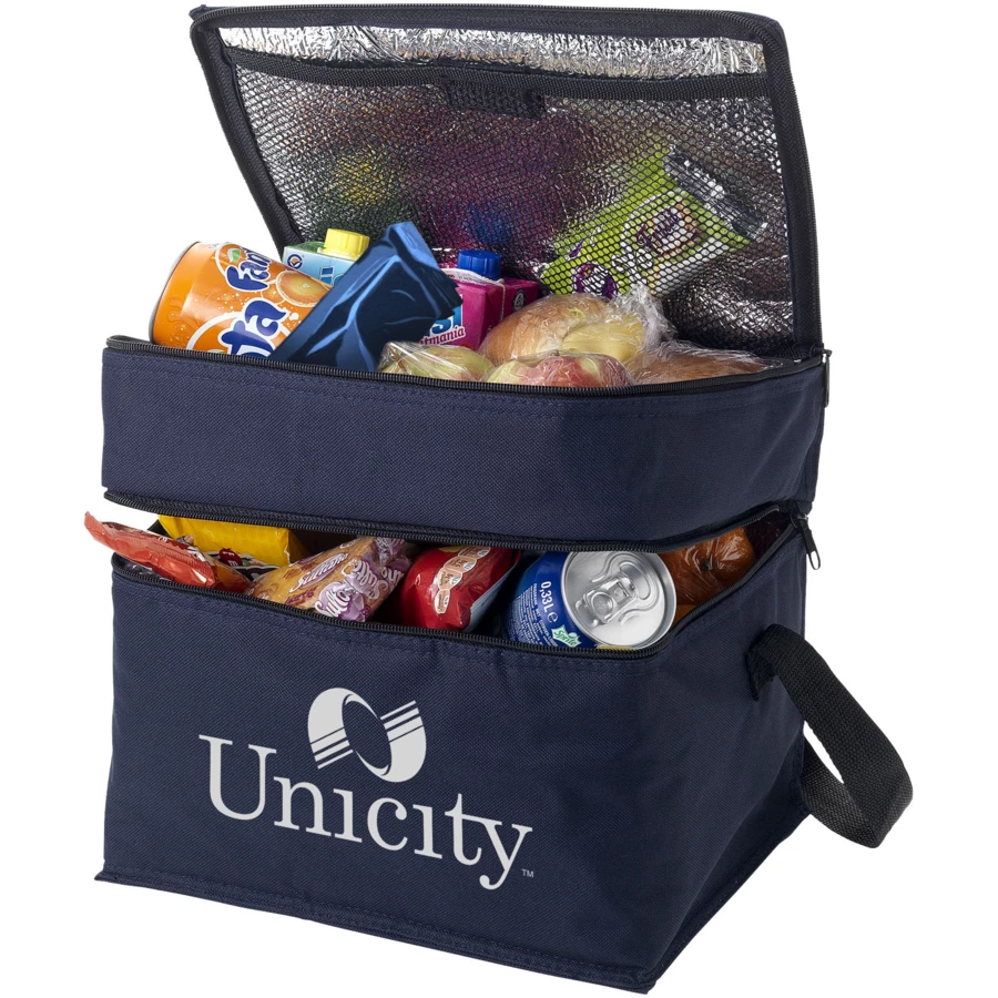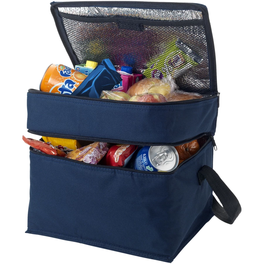 Dzięki torbie chłodzącej Oslo możesz mieć pewność, że napoje i przekąski będą zawsze i wszędzie schłodzone. Torba posiada dwie oddzielne komory zapinane na zamek błyskawiczny. Górna część jest idealna do przechowywania małych przekąsek, a dolna do większych produktów spożywczych. Pasek na ramię jest regulowany, dzięki czemu torba jest łatwa do noszenia przez każdego. Torba na lodówkę wykonana jest z poliestru 600D, wytrzymałego i trwałego materiału.
