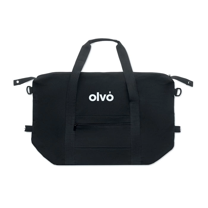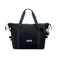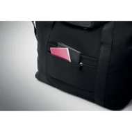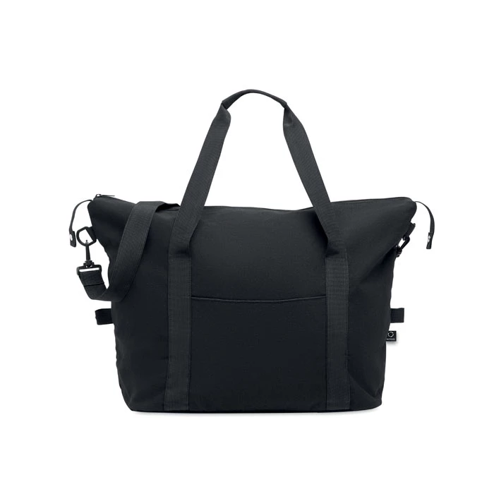 Torba weekendowa z bawełny z recyklingu i poliestru z recyklingu (70%/30%) z podszewką z poliestru 210D RPET. Posiada przednią kieszeń wsuwaną, tylną kieszeń zapinaną na zamek, odpinany i regulowany pasek na ramię oraz wyściełane dno, pasek na walizkę.