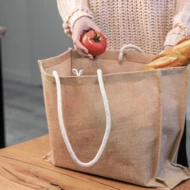 Ekologiczna torba z juty, w naturalnym kolorze, z uchwytami wykonanymi z mocnego sznurka, zamykana na guzik.
