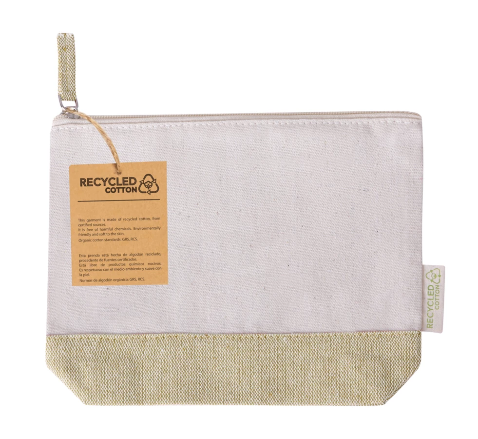Dwukolorowa kosmetyczka wykonana ze 100% bawełny z recyklingu, zapinana na suwak. Z charakterystyczną metką informującą o bawełnie z recyklingu.
