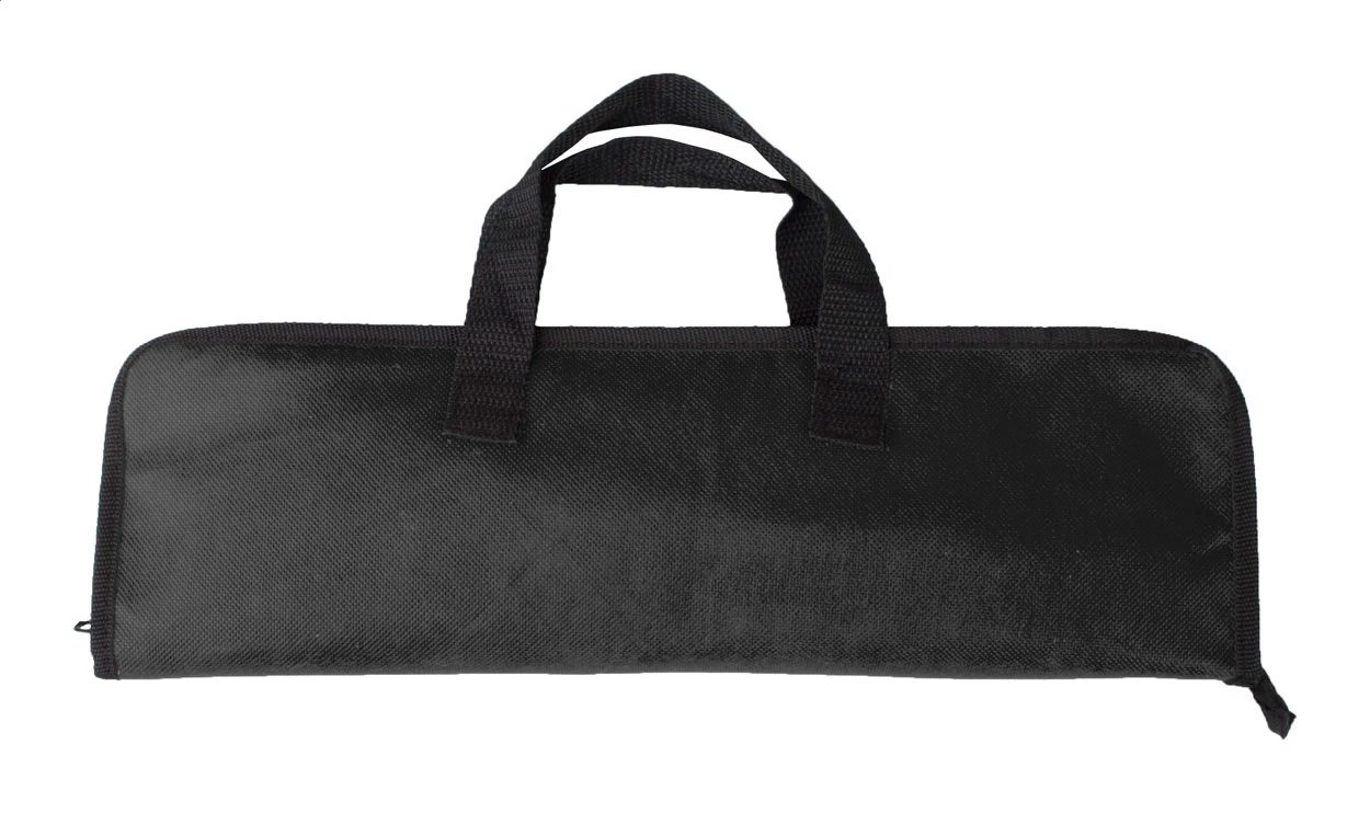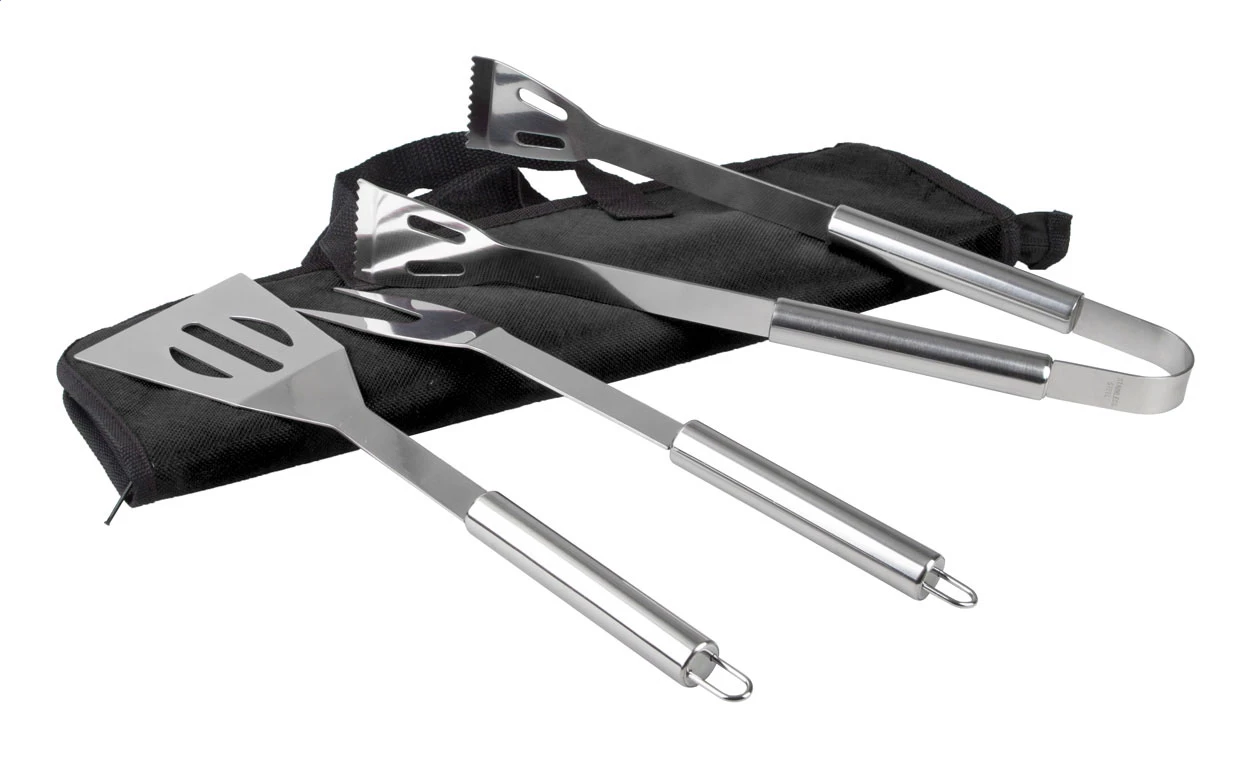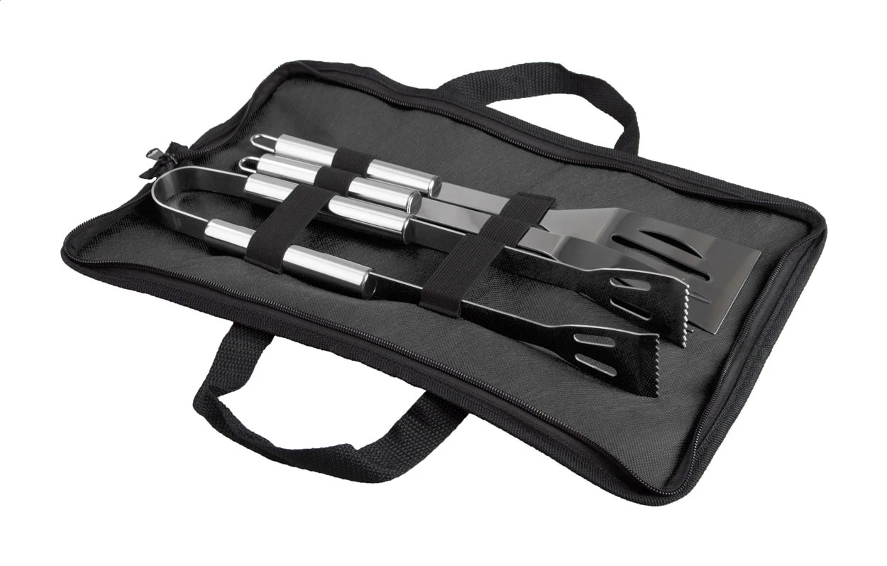 3 - częściowy zestaw do grilla w zapinanej torbie, w skład zestawu wchodzi widelec, łopatka do grila oraz szczypce.