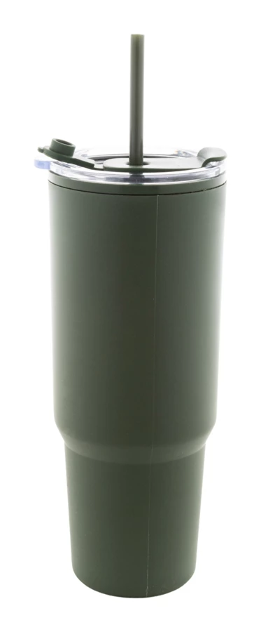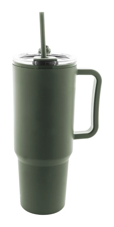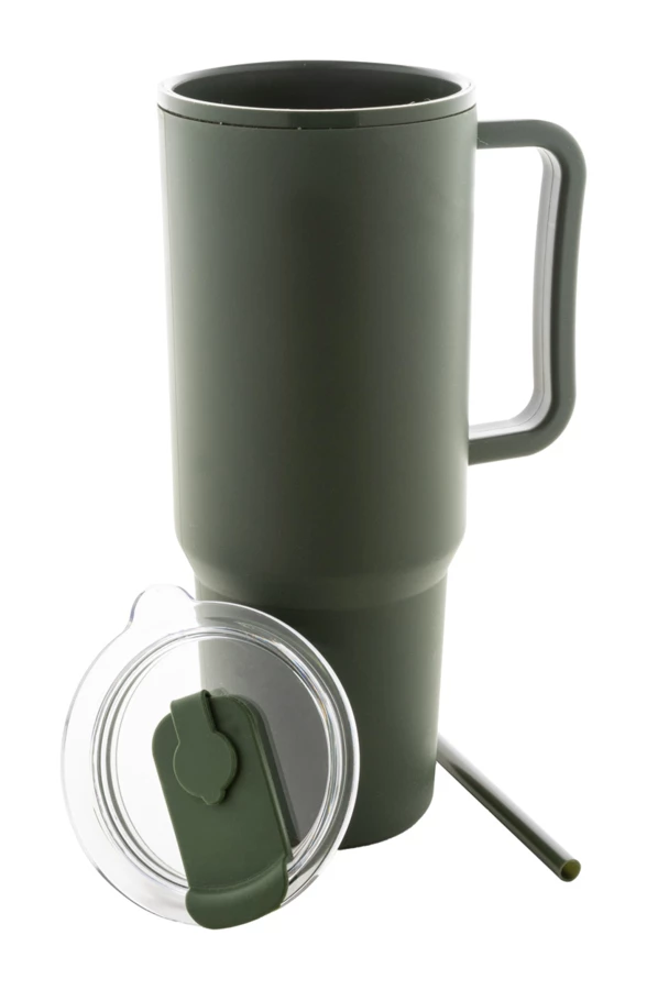 Izolowany kubek termiczny z podwójnymi ściankami, wykonany z tworzywa PP, z pokrywką i słomką. Pojemność 1100 ml.