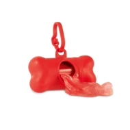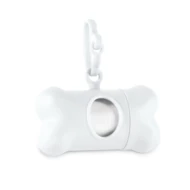 Dozownik na torebki higieniczne dla psów, w kształcie kości, wykonany z materiału z PP. Zawiera 20 higienicznych worków dla psa wykonanych z PE. Zamknięte: 111 x 21 x 15 mm