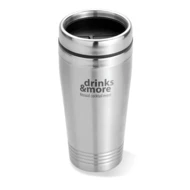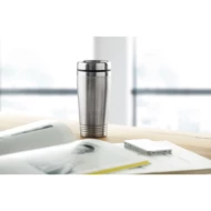 Kubek podróżny ze stali nierdzewnej o podwójnych ściankach, z czarną pokrywką z PP. Pojemność: 400 ml.
