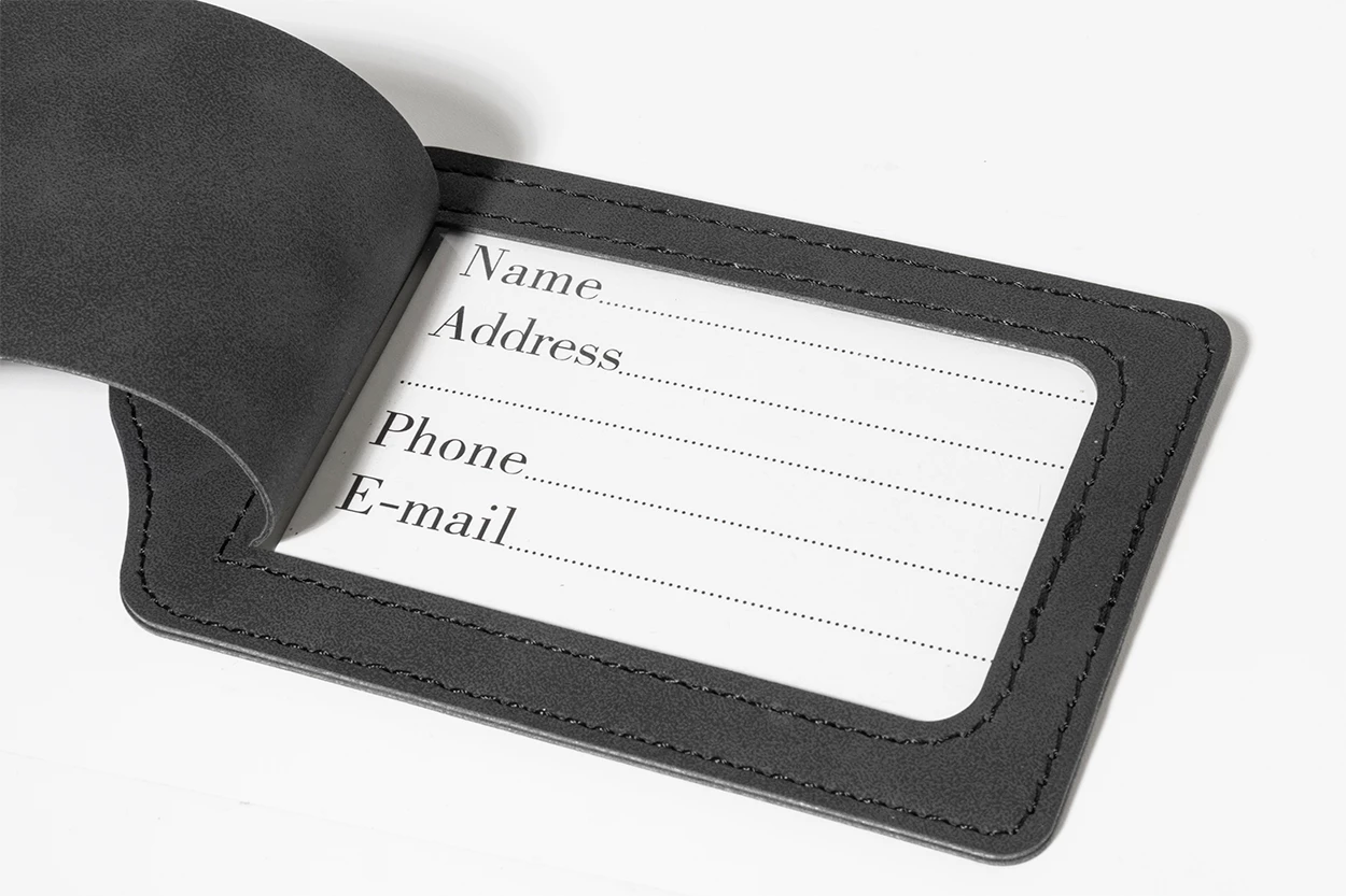 Zestaw etui na paszport i przywieszki do bagażu z recyklingowanej skóry PU. W pudełku z papieru typu kraft.