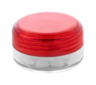 Okrągły, przezroczysty plastikowy słoik z kolorową zakrętką. Zawiera ok. 12 gramów cukierków miętowych.