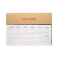 Tygodniowy planer na biurko z okładką z papieru kraft, z kartonowym długopisem, drewnianą linijką i bloczkiem karteczek samoprzylepnych. Niebieski tusz.