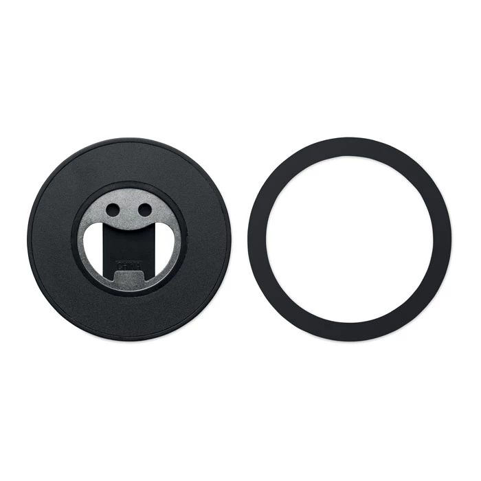 Magnetyczny uchwyt na telefon z otwieraczem do butelek. Kompatybilny z iPhone® 12 i nowszymi. Zawiera dodatkowy magnetyczny metalowy pierścień do obsługi ładowania innych niemagnetycznych telefonów z możliwością ładowania bezprzewodowego.