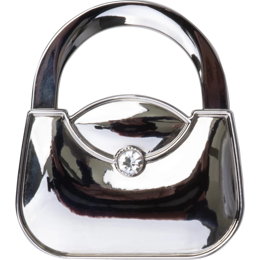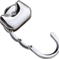 Metalowy uchwyt na torebkę w kształcie torebki. Wystarczy rozłożyć hak, zawiesić uchwyt na krawędzi stołu, a następnie powiesić torebkę na haku.