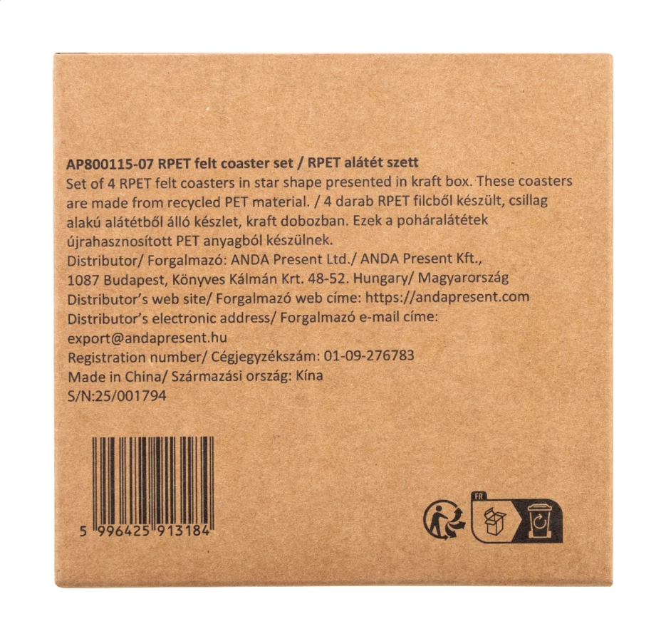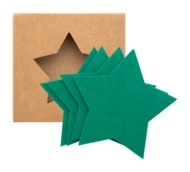 Zestaw 4 świątecznych podstawek filcowych RPET w kształcie gwiazdek. W pudełku z papieru typu kraft.