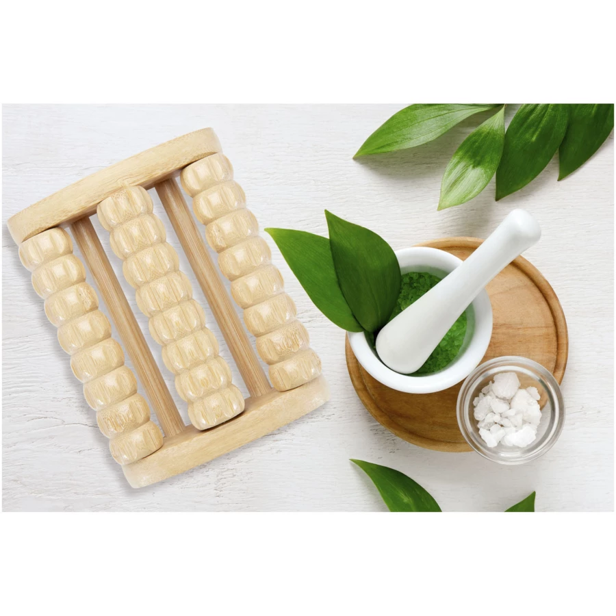 Wałek do masażu stóp wykonany z bambusa z 3 rzędami prętów do masujących. Wystarczy położyć masażer na podłodze, a następnie przesunąć po nim stopy, aby uzyskać przyjemne uczucie relaksu. Użyty bambus jest pozyskiwany i produkowany zgodnie z normami zrównoważonego rozwoju.