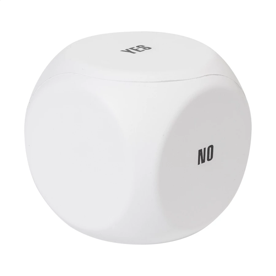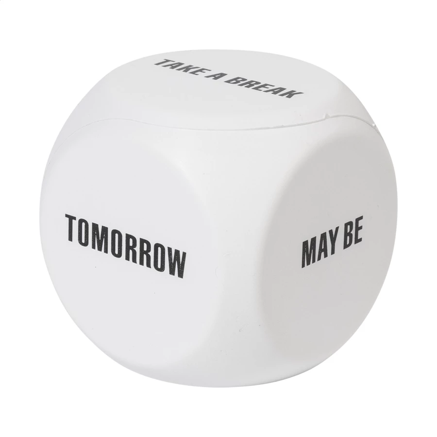 Antystres w kształcie kostki do gry, wykonany z pianki poliuretanowej, ułatwiający podejmowanie decyzji. Zawiera następujące napisy: Take a break, Tomorrow, Maybe, Yes, No oraz pustą stronę do nadruku.