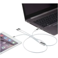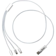 Kabel ten posiada złącze wejściowe USB-A i typu-C w połączeniu ze złączem wyjściowym typu-C, Micro USB i Lightning/Micro USB combi. Dzięki tym wszystkim złączom można ładować większość smartfonów z systemem iOS/Android, aparatów fotograficznych, power banków i słuchawek dousznych. Kabel ma długość 100 cm i jest wykonany z aluminium pochodzącego z recyklingu oraz RPET.