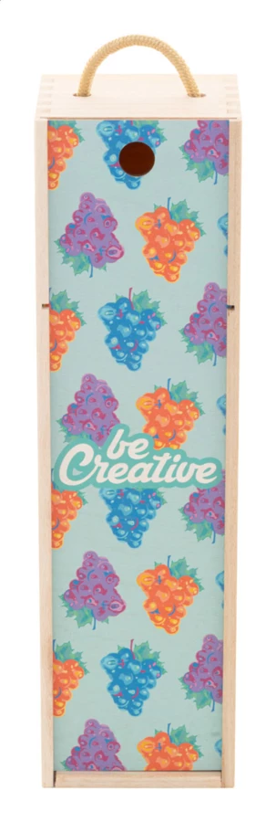 Personalizowana, drewniane pudełko na wino z uchwytem na sznurek i wieczkiem z nadrukiem w full kolorze. Cena obejmuje druk UV LED. Min. ilość: 50 szt.