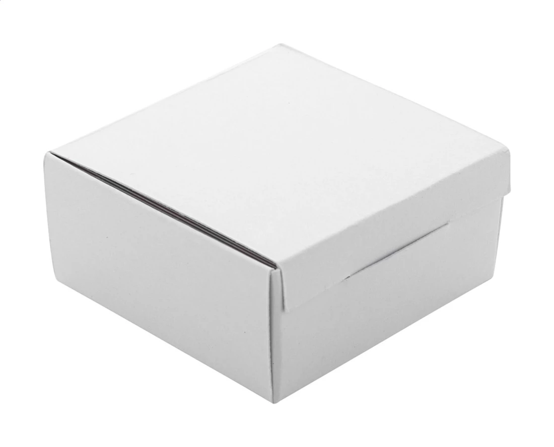 100 szt. wizytówek w kształcie kwadratu, wykonanych na zamówienie, z grafiką w full kolorze po obu stronach. Matowy biały papier, 350 g/m². W białym pudełku papierowym.