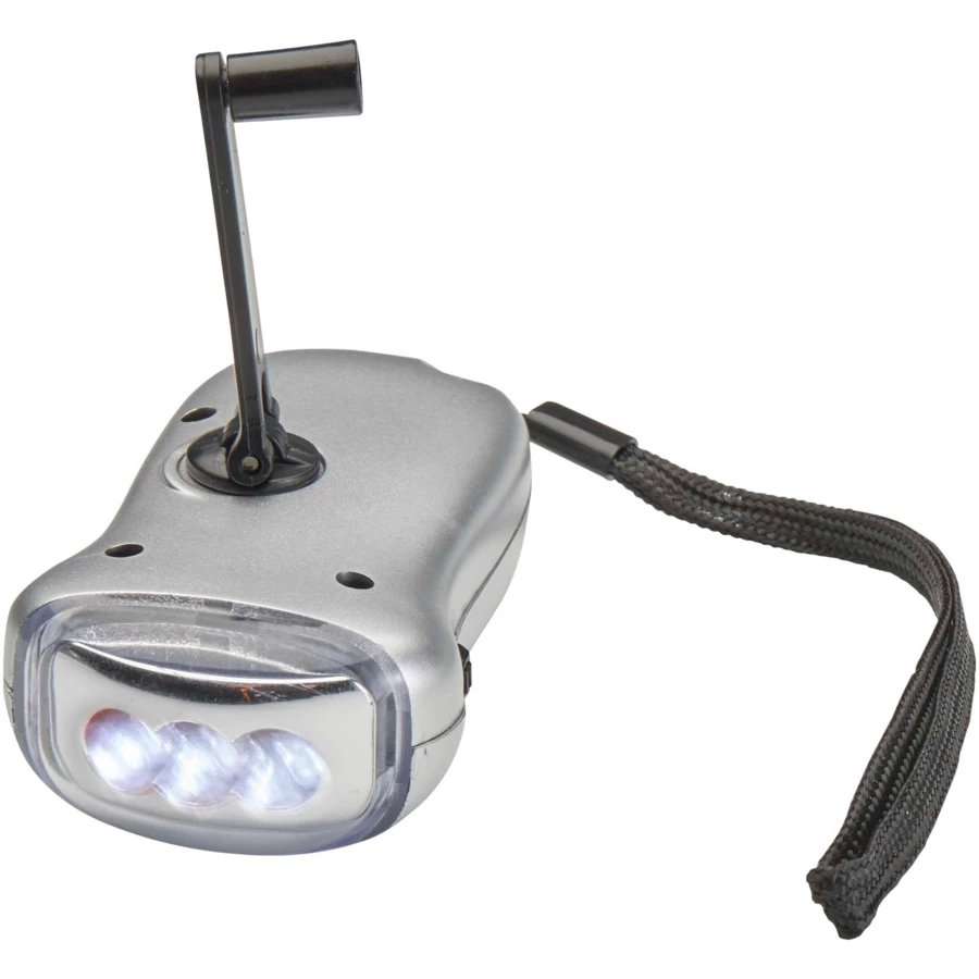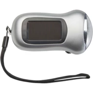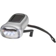 Kompaktowa latarka solarna o jasności 10.000 mcd. Latarka może być również zasilana ręcznie poprzez obracanie uchwytu.