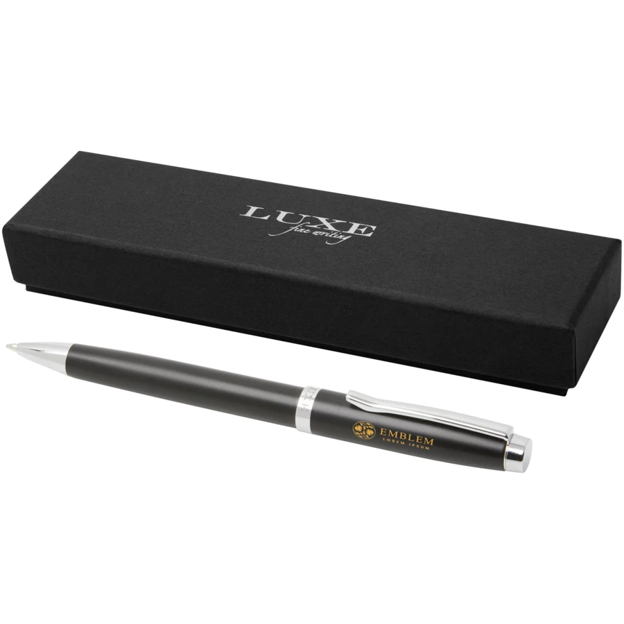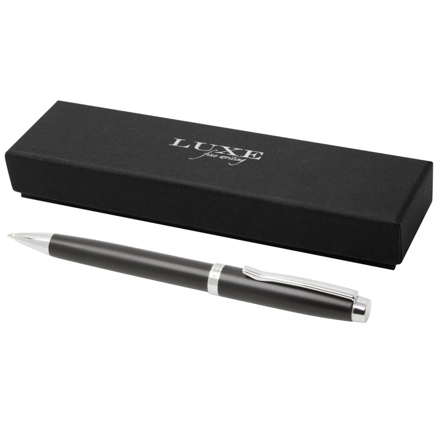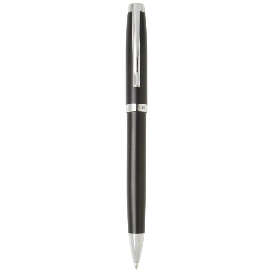 Elegancki długopis o ekskluzywnym wzornictwie dostępny w trzech wersjach kolorystycznych. Z niebieskim wkładem i zapakowany w pudełko upominkowe „LUXE”.