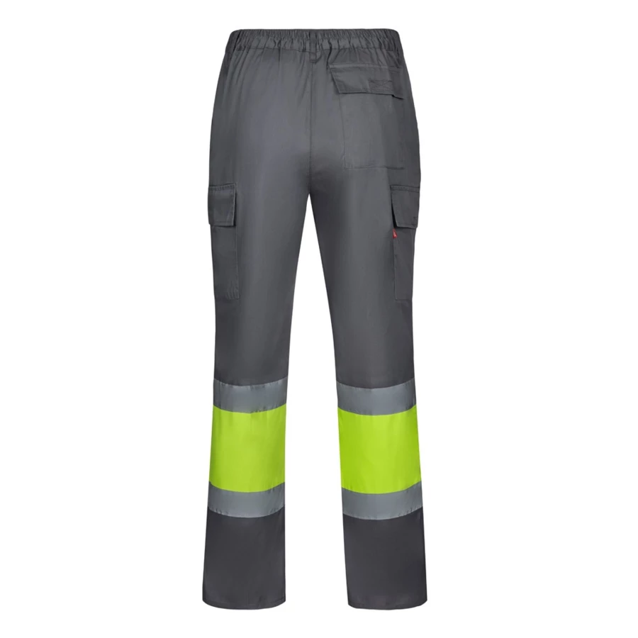 „Dwukolorowe spodnie z diagonalu (190g/m²), wykonane z bawełny (20%) i poliestru (80%). Elastyczny pas, z odblaskowymi paskami na dole spodni i pięcioma kieszeniami (2 kieszenie francuskie, 2 boczne kieszenie mieszkowe i 1 kieszeń z tyłu). Produkt zgodny z rozporządzeniem UE 2016/425, certyfikowany przez EN20471 i klasę Nº 1. Rozmiar: S, M, L, XL, 2XL, 3XL