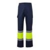 „Dwukolorowe spodnie z diagonalu (190g/m²), wykonane z bawełny (20%) i poliestru (80%). Elastyczny pas, z odblaskowymi paskami na dole spodni i pięcioma kieszeniami (2 kieszenie francuskie, 2 boczne kieszenie mieszkowe i 1 kieszeń z tyłu). Produkt zgodny z rozporządzeniem UE 2016/425, certyfikowany przez EN20471 i klasę Nº 1. Rozmiar: S, M, L, XL, 2XL, 3XL