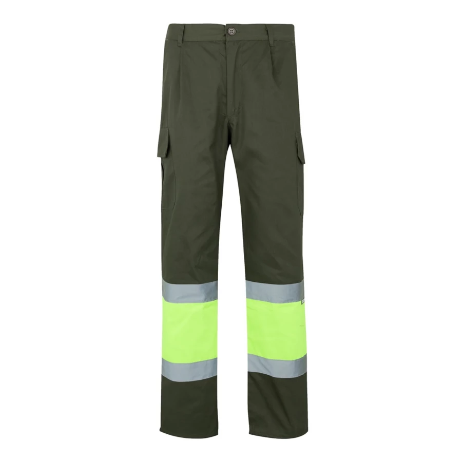 Spodnie dwukolorowe, diagonalne (210g/m²), na podszewce, z wieloma kieszeniami, z bawełny (20%) i poliestru (80%). Z gumką w pasie, z odblaskowymi paskami u dołu spodni. Zawiera sześć kieszeni (2 Kieszenie francuskie, 2 boczne kieszenie mieszkowe i 2 tylne). Produkt zgodny z rozporządzeniem UE 2016/425, certyfikowany przez EN20471 i klasę Nº 1. Rozmiar: S, M, L, XL, 2XL, 3XL