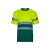 „T-shirt dwukolorowy piqué (150g/m²), wykonany z bawełny (55%) i poliestru (45%). Krótkie rękawy, okrągły dekolt wykończony ściągaczem w kontrastowym kolorze, segmentowe paski odblaskowe na tułowiu i rękawach. Produkt zgodny z rozporządzeniem UE 2016/425, certyfikowany przez EN20471 i klasę Nº 1. Rozmiar: S, M, L, XL, 2XL, 3XL