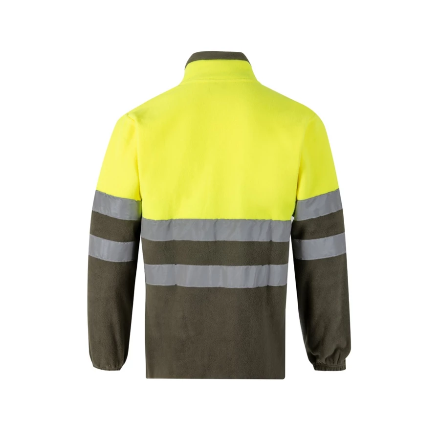 Dwukolorowa kurtka polarowa (280g/m²), z poliestru (100%). Z centralnym zamkiem, elastycznymi mankietami i możliwością regulacji ze stoperem z boku. Odblaskowe paski na tułowiu i rękawach. Zawiera trzy kieszenie zapinane na zamek. Produkt zgodny z rozporządzeniem UE 2016/425, certyfikowany przez EN20471 i klasę Nº 1. Rozmiar: 4XL, 5XL