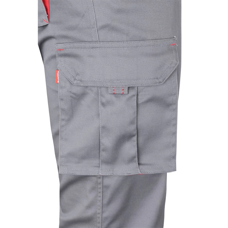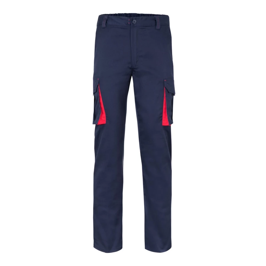 Dwukolorowe, elastyczne spodnie z wieloma kieszeniami (240g/m²), wykonane z bawełny (46%), EME (38%) i poliestru (16%). Krój slim fit, elastyczny pas i kontrastowy kolor klinów, ściągaczy i szwów. Zawiera sześć kieszeni (2 kieszenie francuskie, 2 boczne kieszenie z klinem i 2 tylne kieszenie z klinem). Size: 34, 36, 38, 40, 42, 44, 46, 48, 50, 52, 54, 56, 58, 60
