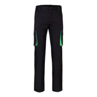 Dwukolorowe, elastyczne spodnie z wieloma kieszeniami (240g/m²), wykonane z bawełny (46%), EME (38%) i poliestru (16%). Krój slim fit, elastyczny pas i kontrastowy kolor klinów, ściągaczy i szwów. Zawiera sześć kieszeni (2 kieszenie francuskie, 2 boczne kieszenie z klinem i 2 tylne kieszenie z klinem). Size: 34, 36, 38, 40, 42, 44, 46, 48, 50, 52, 54, 56, 58, 60
