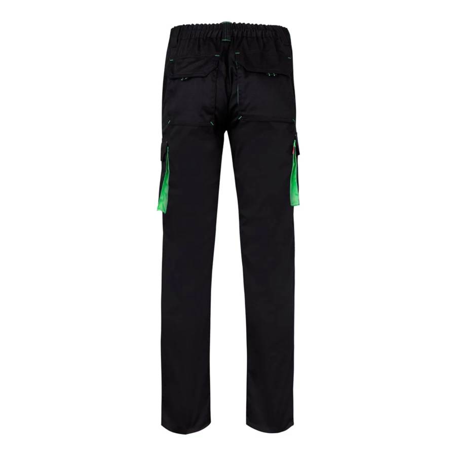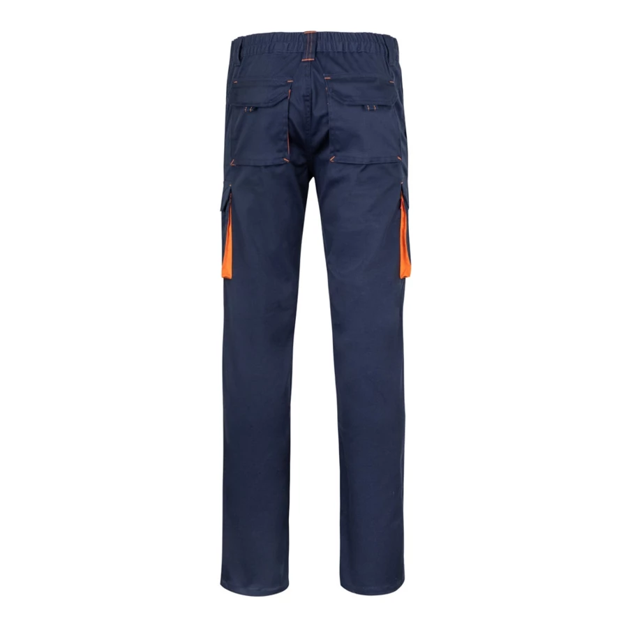 Dwukolorowe, elastyczne spodnie z wieloma kieszeniami (240g/m²), wykonane z bawełny (46%), EME (38%) i poliestru (16%). Krój slim fit, elastyczny pas i kontrastowy kolor klinów, ściągaczy i szwów. Zawiera sześć kieszeni (2 kieszenie francuskie, 2 boczne kieszenie z klinem i 2 tylne kieszenie z klinem). Size: 34, 36, 38, 40, 42, 44, 46, 48, 50, 52, 54, 56, 58, 60