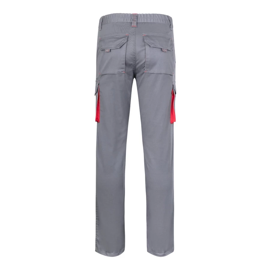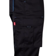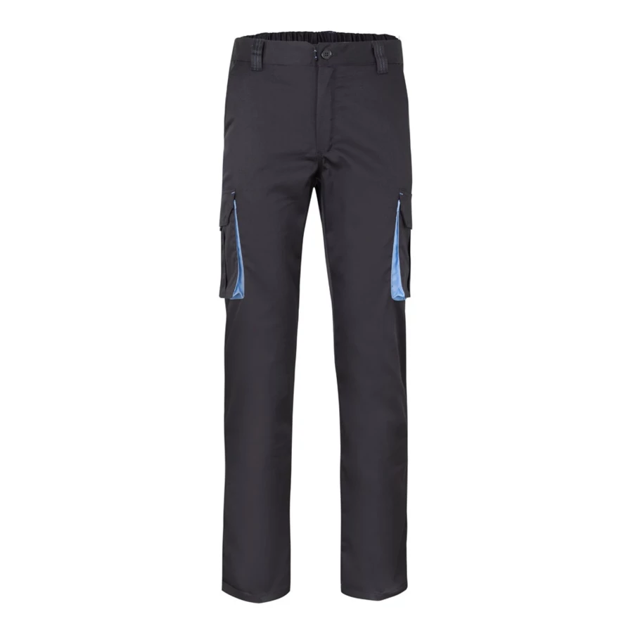 Dwukolorowe, elastyczne spodnie z wieloma kieszeniami (240g/m²), wykonane z bawełny (46%), EME (38%) i poliestru (16%). Krój slim fit, elastyczny pas i kontrastowy kolor klinów, ściągaczy i szwów. Zawiera sześć kieszeni (2 kieszenie francuskie, 2 boczne kieszenie z klinem i 2 tylne kieszenie z klinem). Size: 34, 36, 38, 40, 42, 44, 46, 48, 50, 52, 54, 56, 58, 60