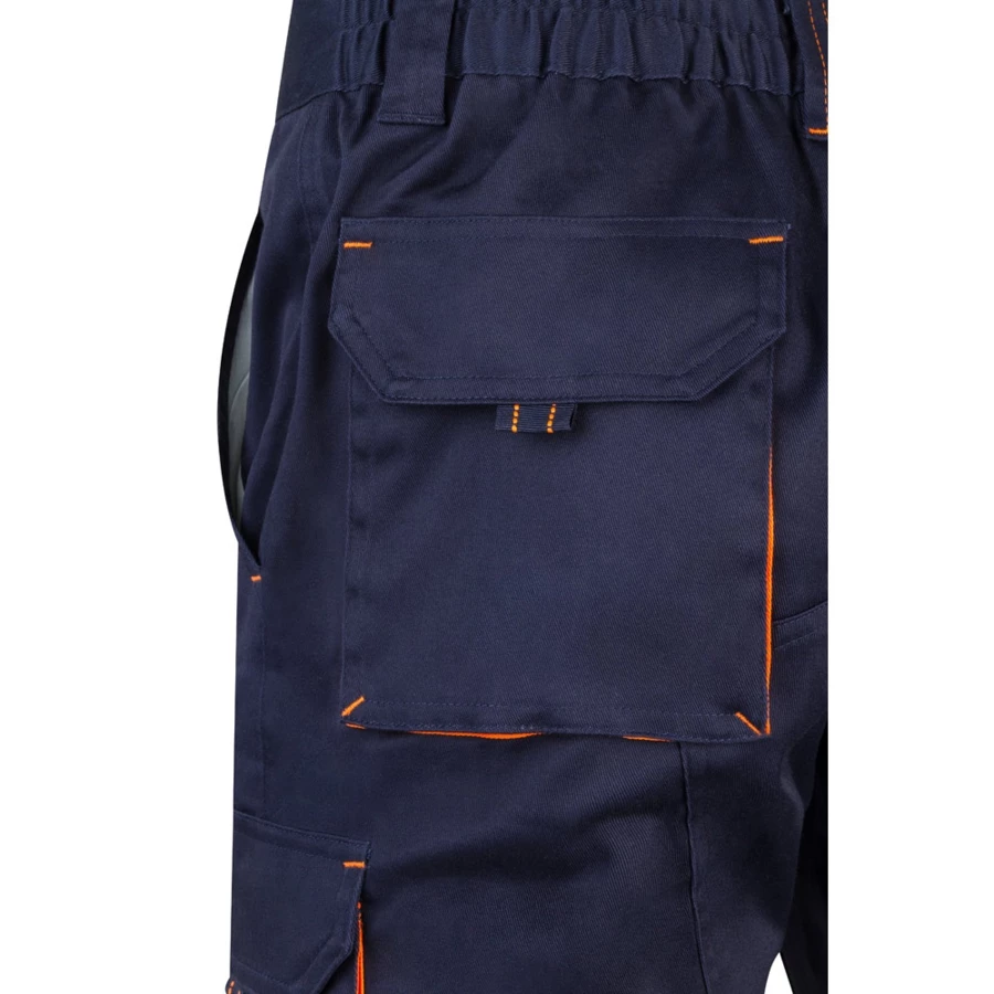 Dwukolorowe, rozciągliwe bermudy z wieloma kieszeniami (240 g/m²), wykonane z bawełny (46%), EME (38%) i poliestru (16%). Z elastycznym pasem, kontrastowymi wstawkami, patką i przeszyciami oraz wzmocnieniem z materiału z tyłu. Zawiera sześć kieszeni (2 kieszenie francuskie, 2 boczne kieszenie z klinem i 2 tylne kieszenie z klinem). Size: 34, 36, 38, 40, 42, 44, 46, 48, 50, 52, 54, 56, 58, 60