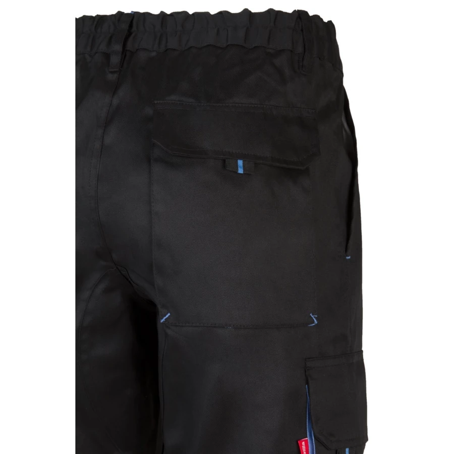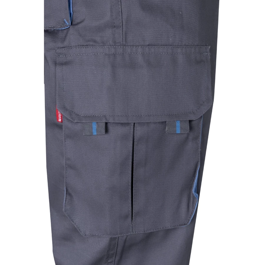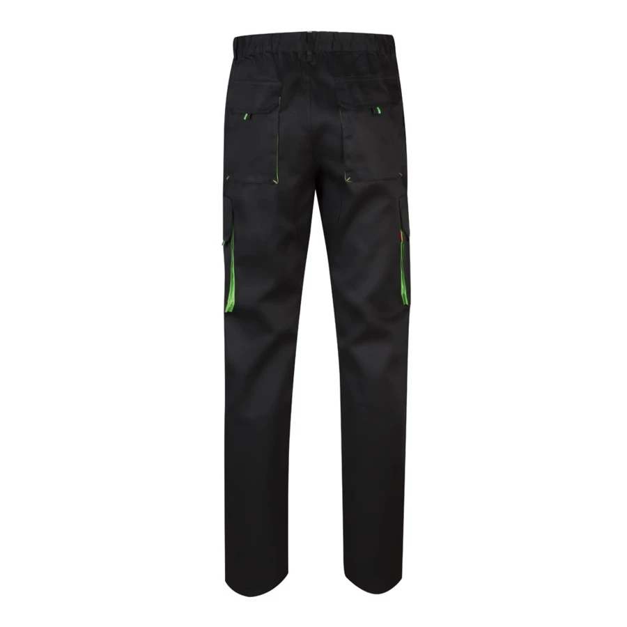Dwukolorowe spodnie z wieloma kieszeniami o diagonalnym splocie (200g/m²), z bawełny (35%) i poliestru (65%). Z elastycznym pasem i kontrastowym kolorem klinów, ściągaczy i szwów. Zawiera sześć kieszeni: (2 kieszenie francuskie, 2 boczne kieszenie z klinem i 2 tylne kieszenie z klinem). Size: 34, 36, 38, 40, 42, 44, 46, 48, 50, 52, 54, 56, 58, 60
