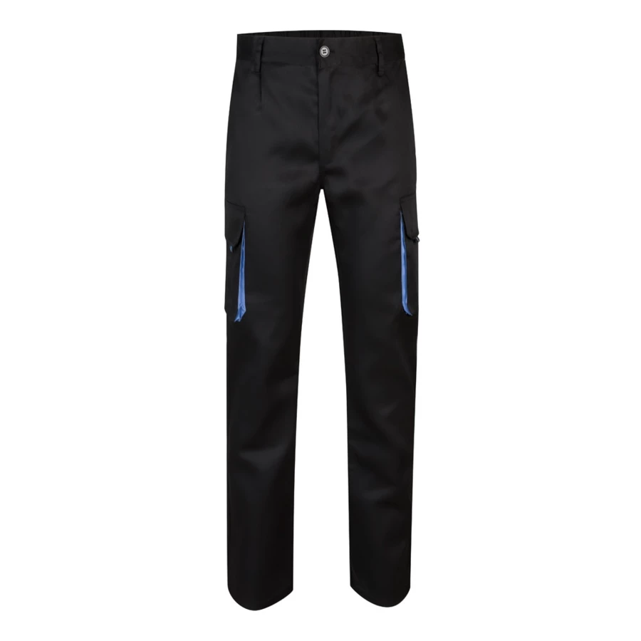 Dwukolorowe spodnie z wieloma kieszeniami o diagonalnym splocie (200g/m²), z bawełny (35%) i poliestru (65%). Z elastycznym pasem i kontrastowym kolorem klinów, ściągaczy i szwów. Zawiera sześć kieszeni: (2 kieszenie francuskie, 2 boczne kieszenie z klinem i 2 tylne kieszenie z klinem). Size: 34, 36, 38, 40, 42, 44, 46, 48, 50, 52, 54, 56, 58, 60